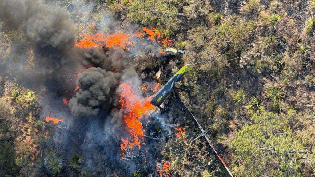 En plena misión para combatir el incendio forestal que azota la sierra de Arteaga, un helicóptero que transportaba a ocho brigadistas sufrió un desplome durante su aproximación al área afectada. El suceso se registró en el Cañón de La Rioja, uno de los puntos críticos del siniestro.