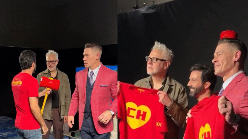 Pero sin duda, el instante que más captó la atención fue cuando Cena se unió a Gunn y al actor Pablo Cruz —quien interpretará al icónico personaje en la próxima serie “Chespirito: Sin querer queriendo”— para posar con la clásica camiseta del Chapulín Colorado. Las imágenes, que rápidamente se viralizaron en redes sociales, mostraron a las tres figuras con el chipote chillón en alto, fusionando el universo de DC con el imaginario de la comedia mexicana.