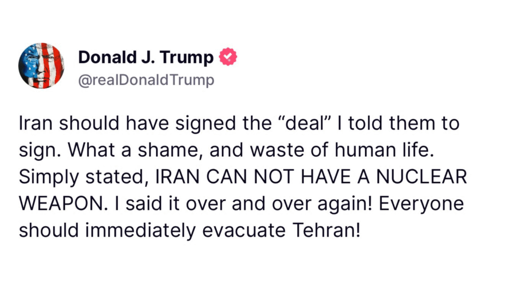 El presidente de Estados Unidos, Donald Trump, causó conmoción internacional este lunes al advertir a los ciudadanos iraníes que evacúen Teherán de inmediato, en medio de la creciente tensión entre Irán e Israel. Su mensaje fue publicado en Verdad Social, sin proporcionar detalles sobre una amenaza específica, pero en el contexto de una ofensiva israelí que ha incluido bombardeos a objetivos clave dentro del país persa.